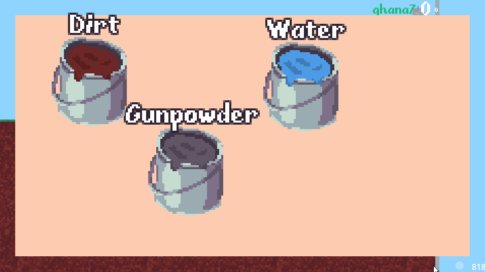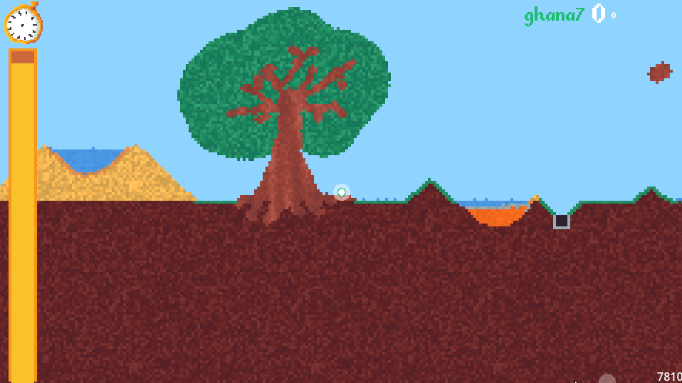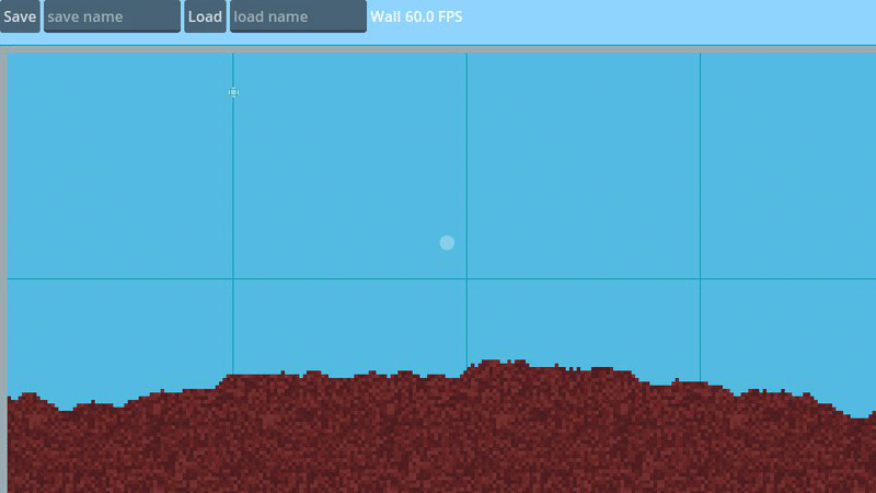 it's already by far the most impressive thing i've ever made on the tech side, between a falling sand simulator, marching squares for the physics collisions, one (1) whole shader, and vaguely functional ROLLBACK NETCODE (15) for the multiplayer, and i'm super proud of it. it's an idea that i've been enamored with and noodling on for at least four years now (see snad from college) and i'm actually so shocked it's made it so far. now i just have to make it fun :)